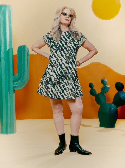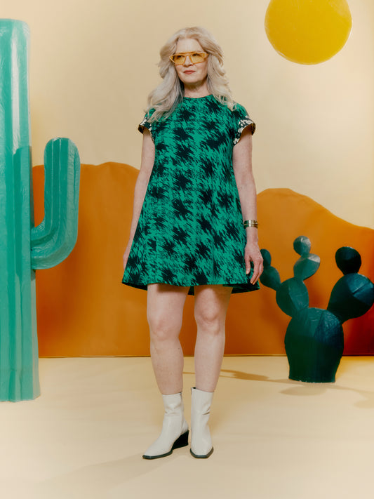 Drop Shoulder Pocket Dress - Houndstooth Print Green + Blown Up Denim Print
