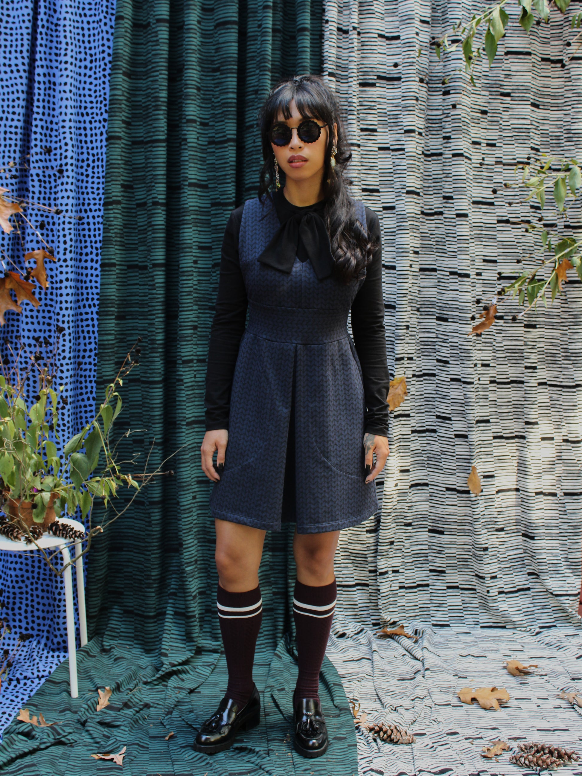 This overalls sweatshirt dress has adjustable straps to fit various bust sizes and waist circumferences. Straps criss cross in the back and loop through two loops in the waistband. The tie can be secured in the front or the back of the garment--it depends on the personal preference. We have both front and back ties pictured above. We also made deep side seam pockets!. The print on this garment is is made to look like a chunky knit sweater fabric. Subtle and fun.