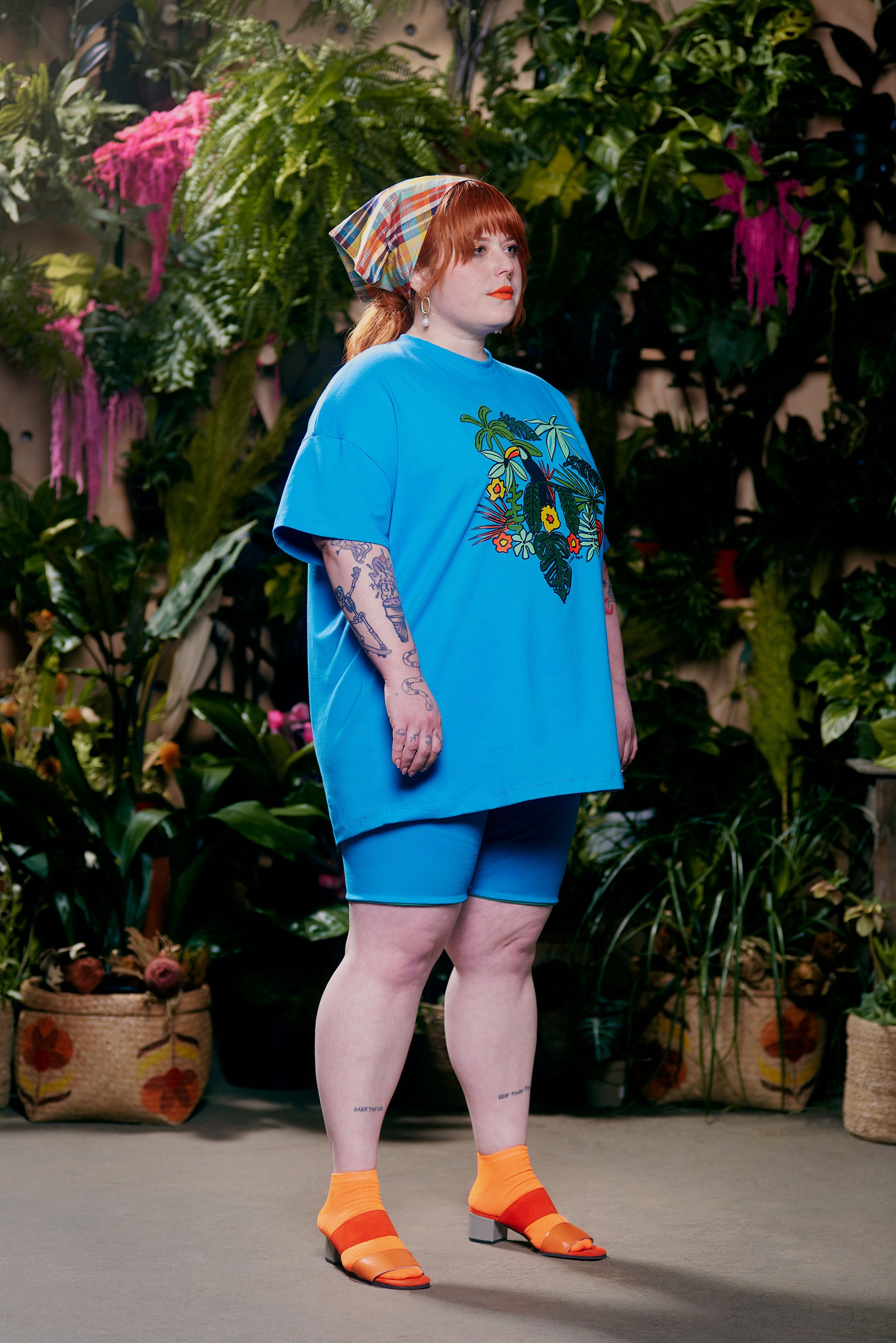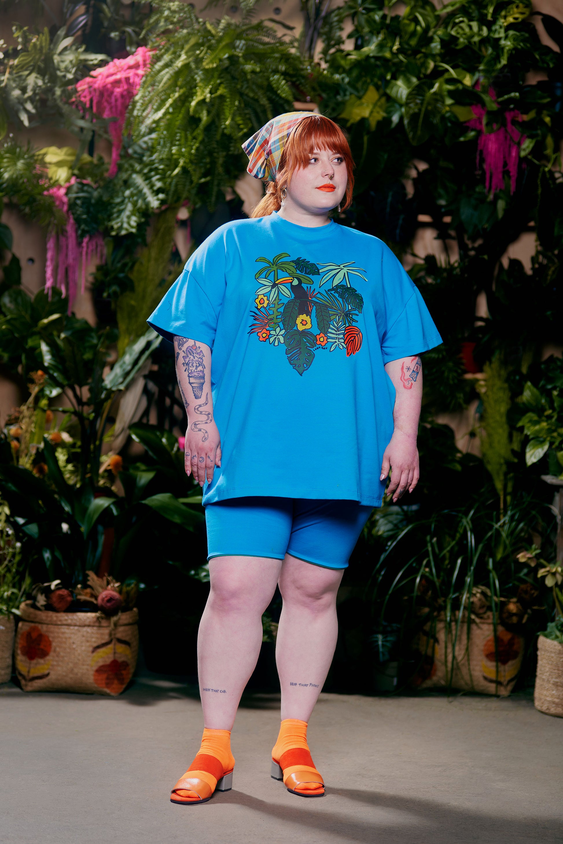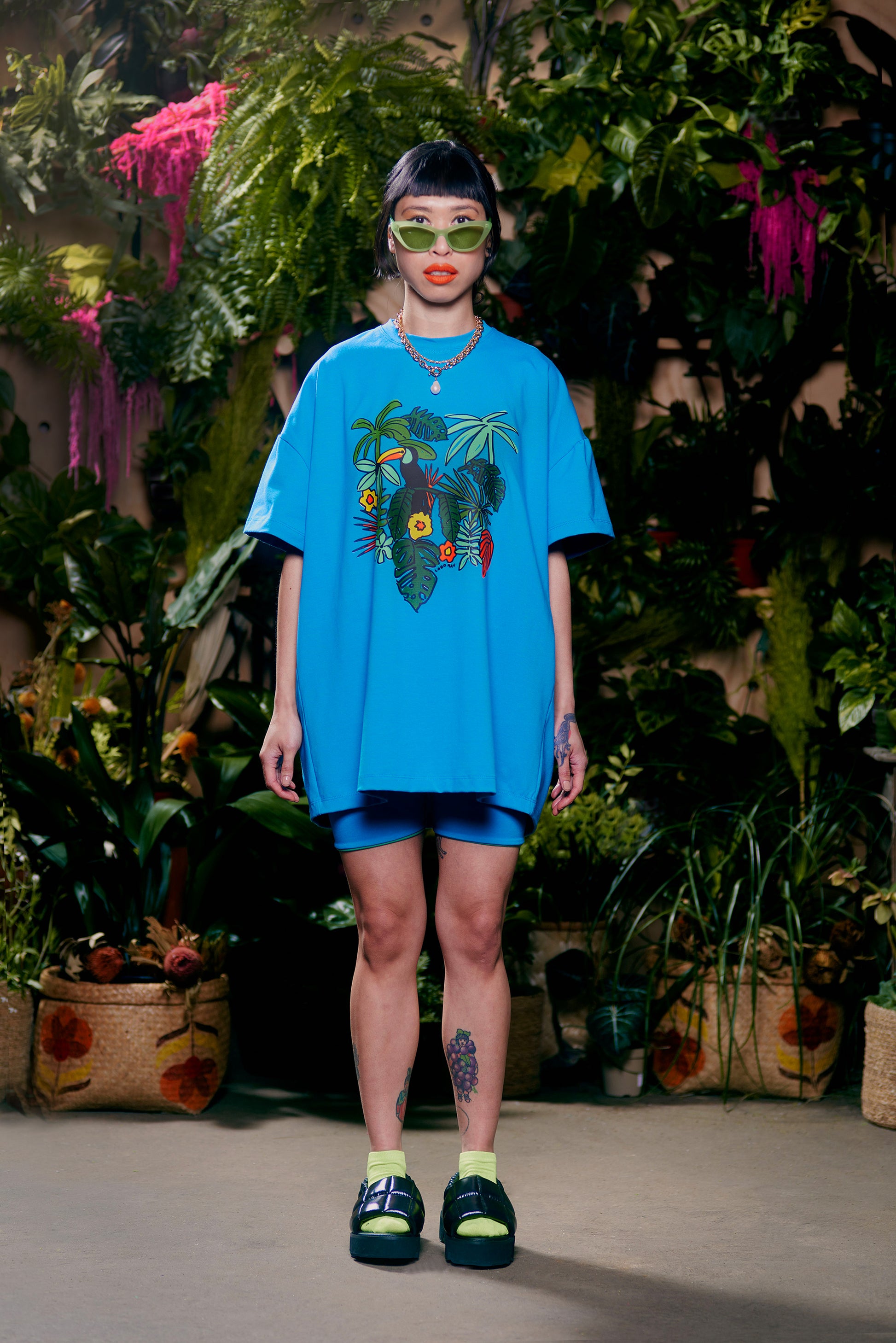 Featuring tropical foliage and a colorful toucan friend, our Amazon graphic print was inspired by our Brazilian heritage and our boat trips through the jungle. Printed in Philadelphia using organic ink. Made from our signature organic cotton jersey fabric, this unisex style features drop-shoulders and a boxy oversized fit. Pair with the Reversible Biker Shorts for a foolproof outfit that works every time!