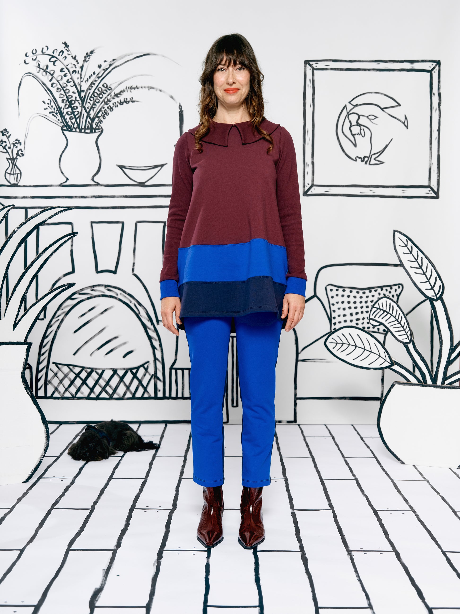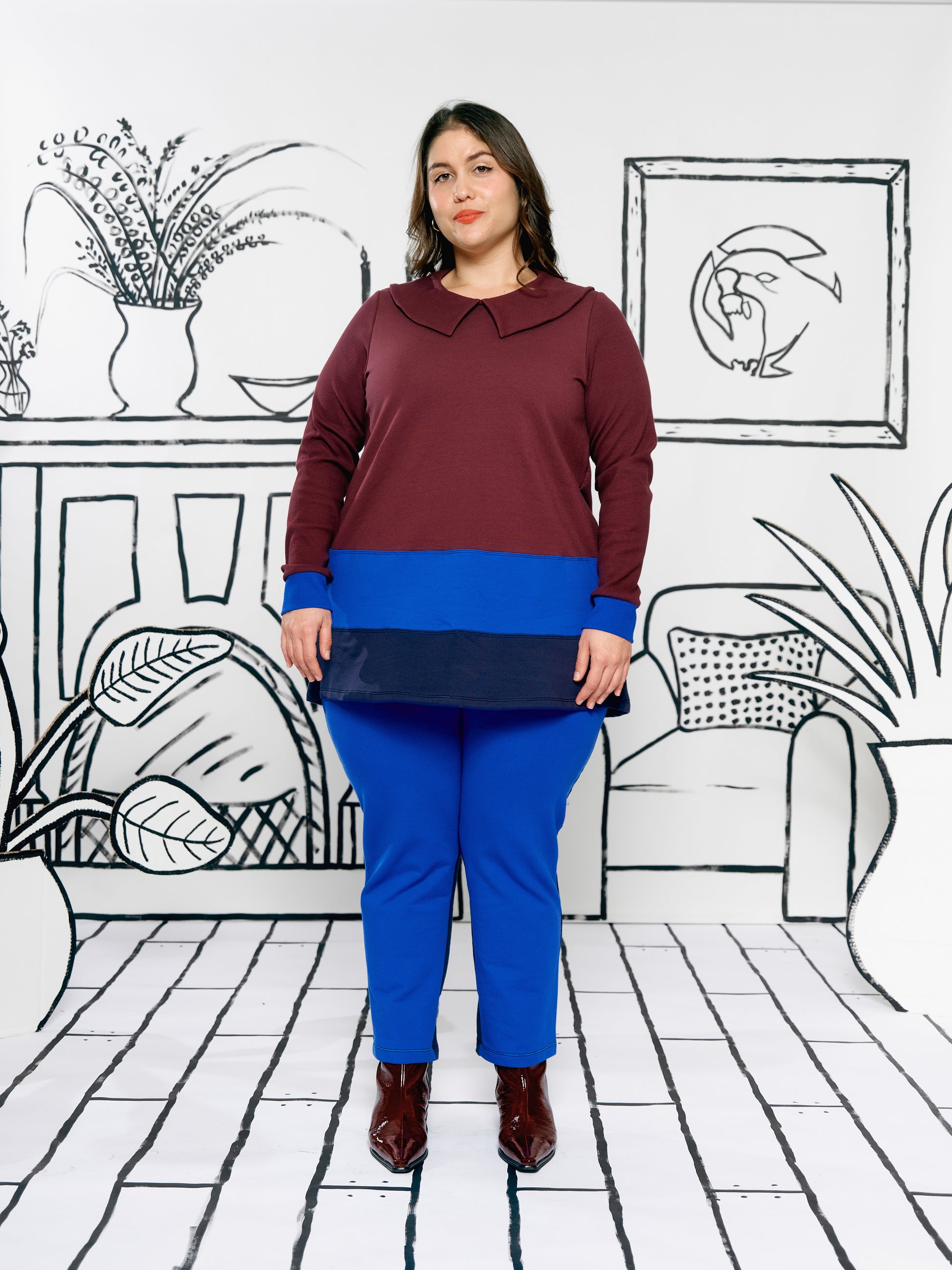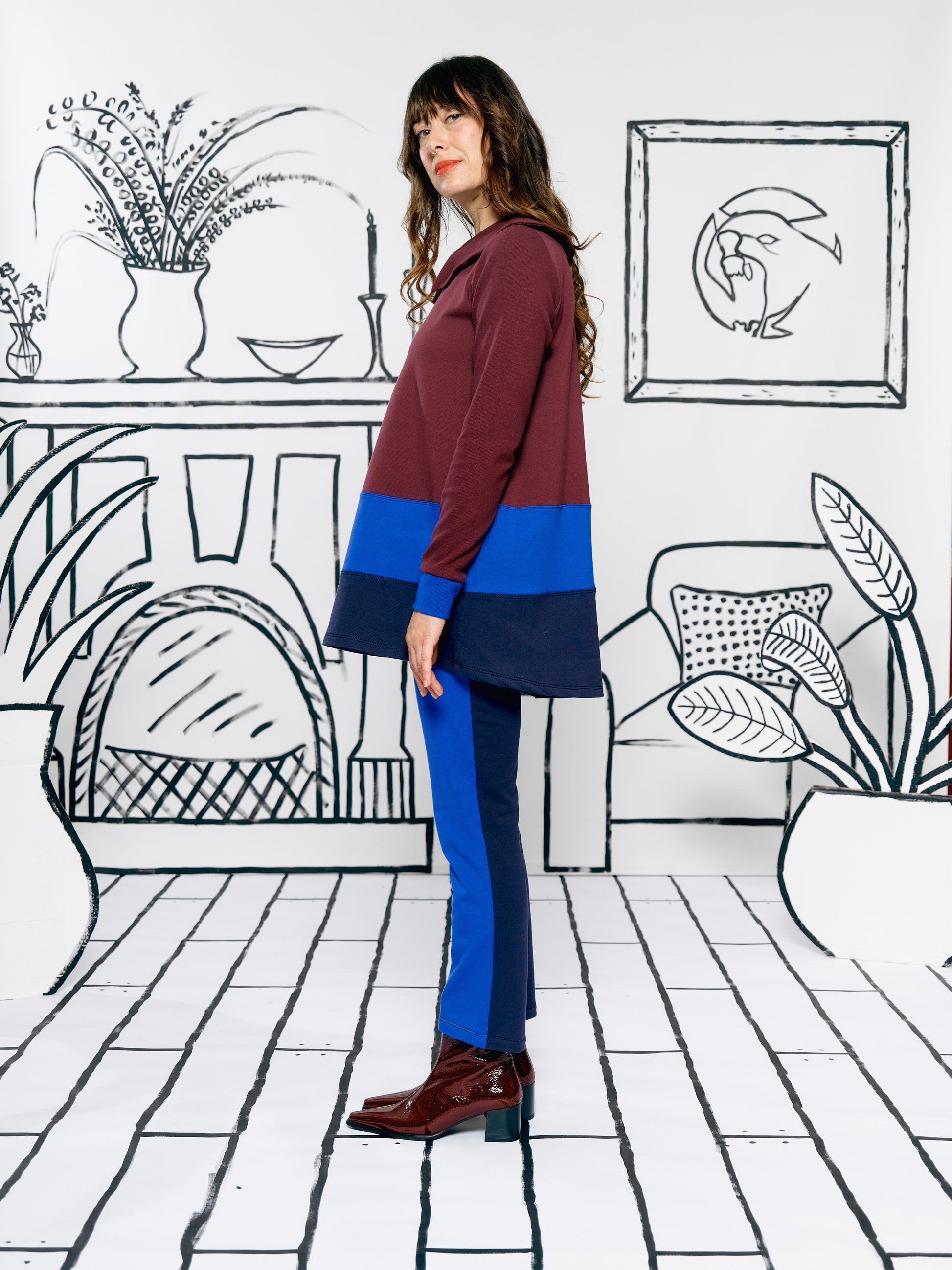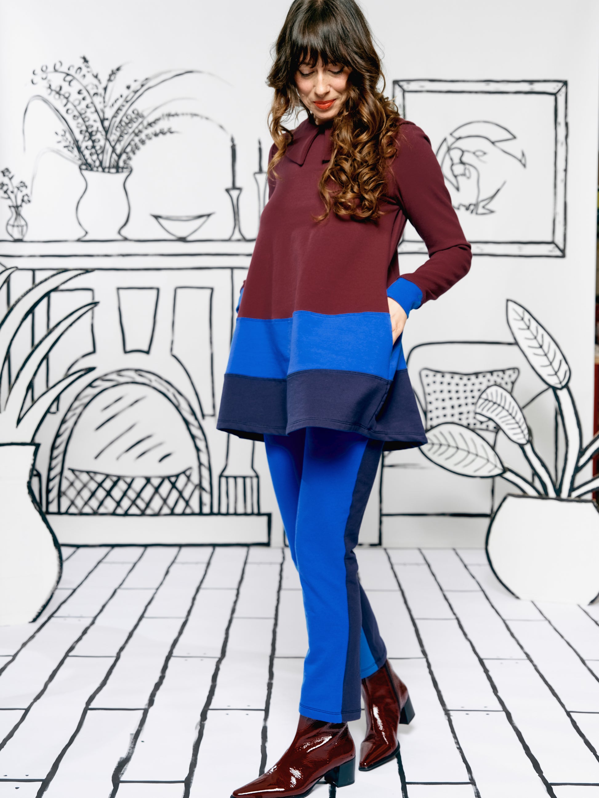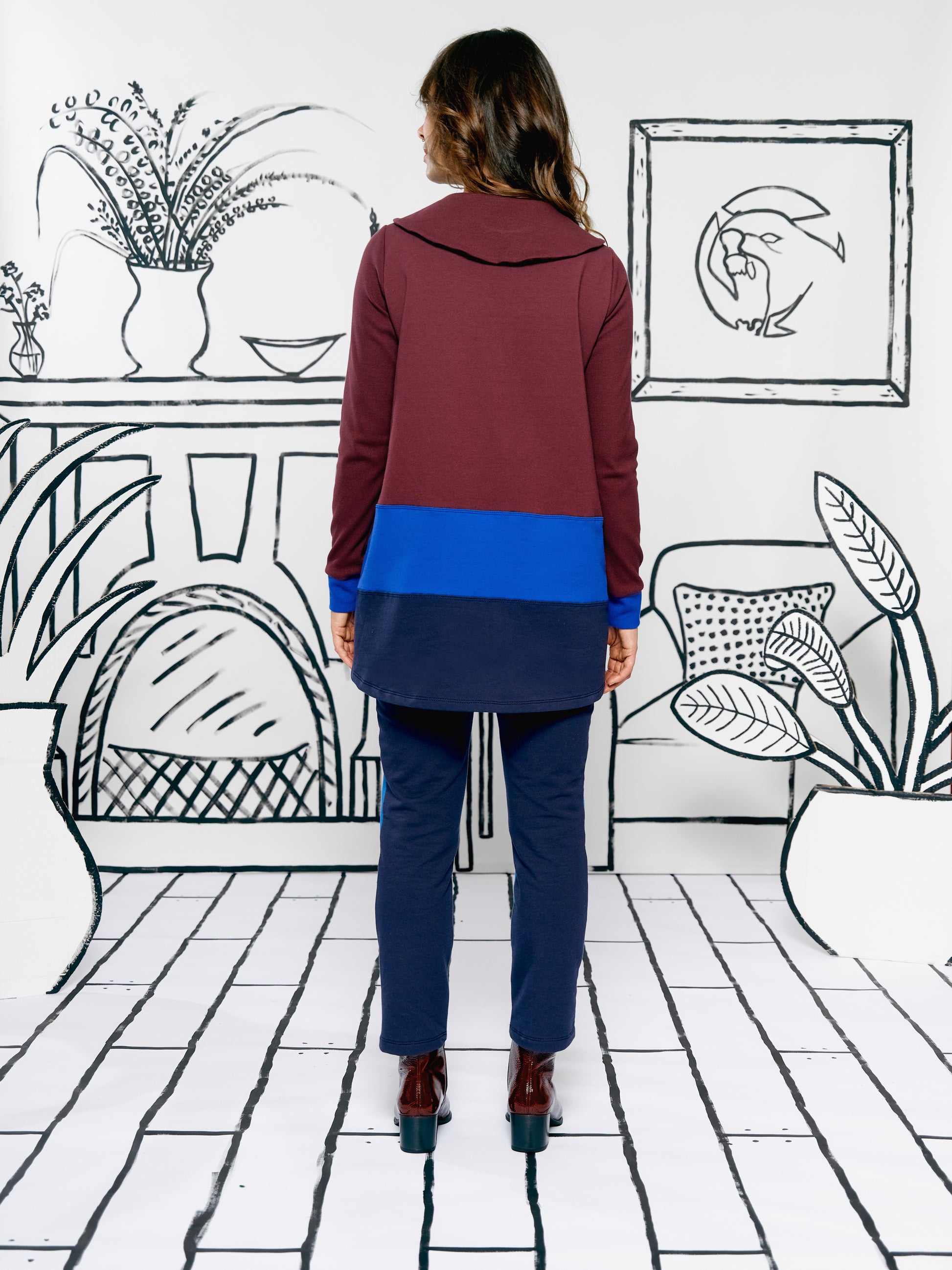 A-line shape with buttery soft, stretchy organic cotton ribbing sleeves and a color blocked bodice for simple sophistication anywhere. Featuring two side pockets. Create an effortless look with our Perfeito Pant, Wide Leg Pant, or your favorite Legging.