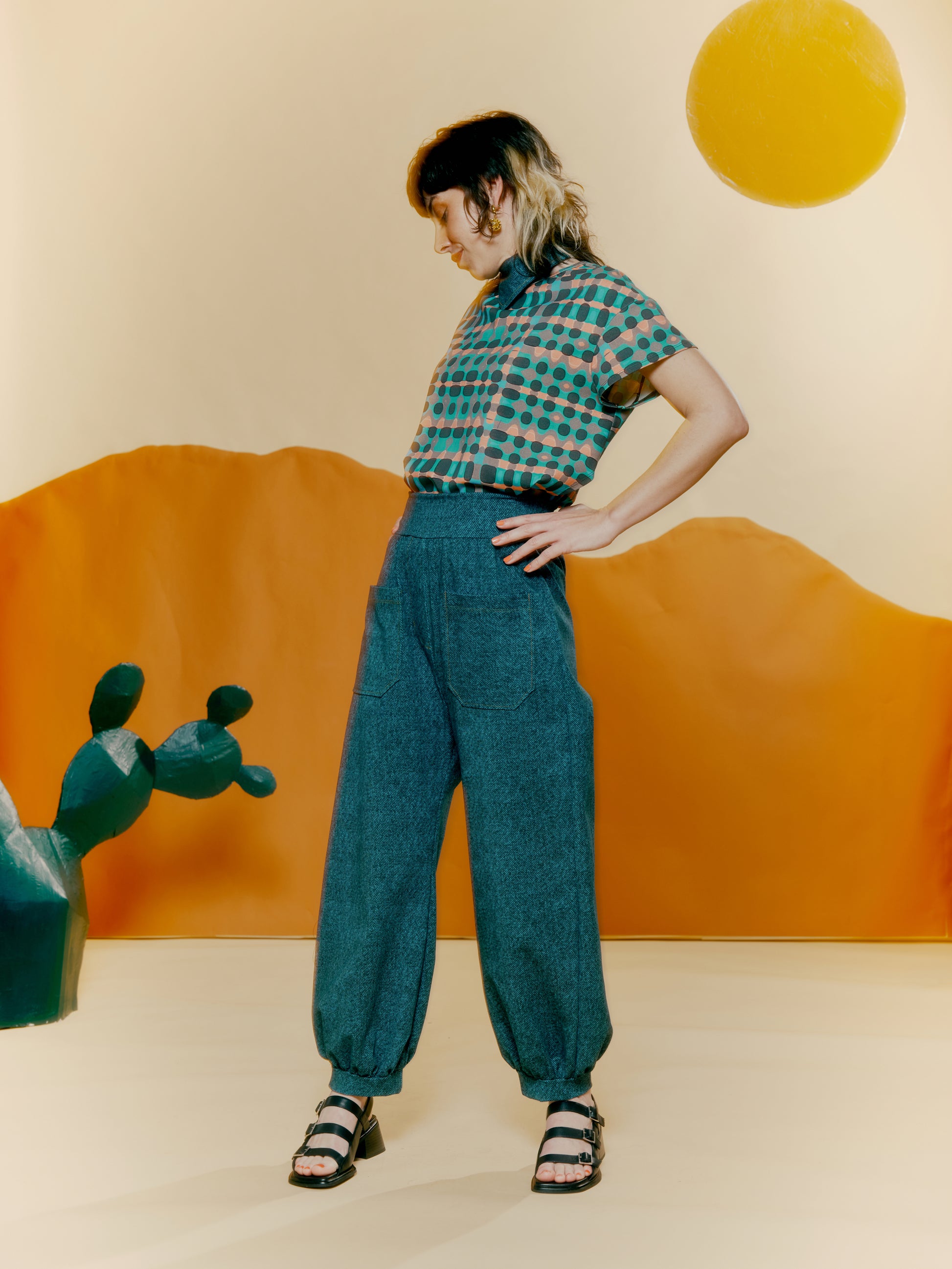 These denim-printed pants combine the relaxed look of denim with the comfort and style of a gathered jersey pant. Made from luxe organic cotton stretch jersey, these are not your mamma’s jeggings. Featuring a gathered waistband and cuffs,and two large front patch pockets, with contrast stitching, these pants are the perfect transitional piece to be paired with a light drapey sweater in spring to a tank top to stay cool in the summer. Pre-shrunk, Machine Wash Cold, Line Dry. Made in Philadelphia.