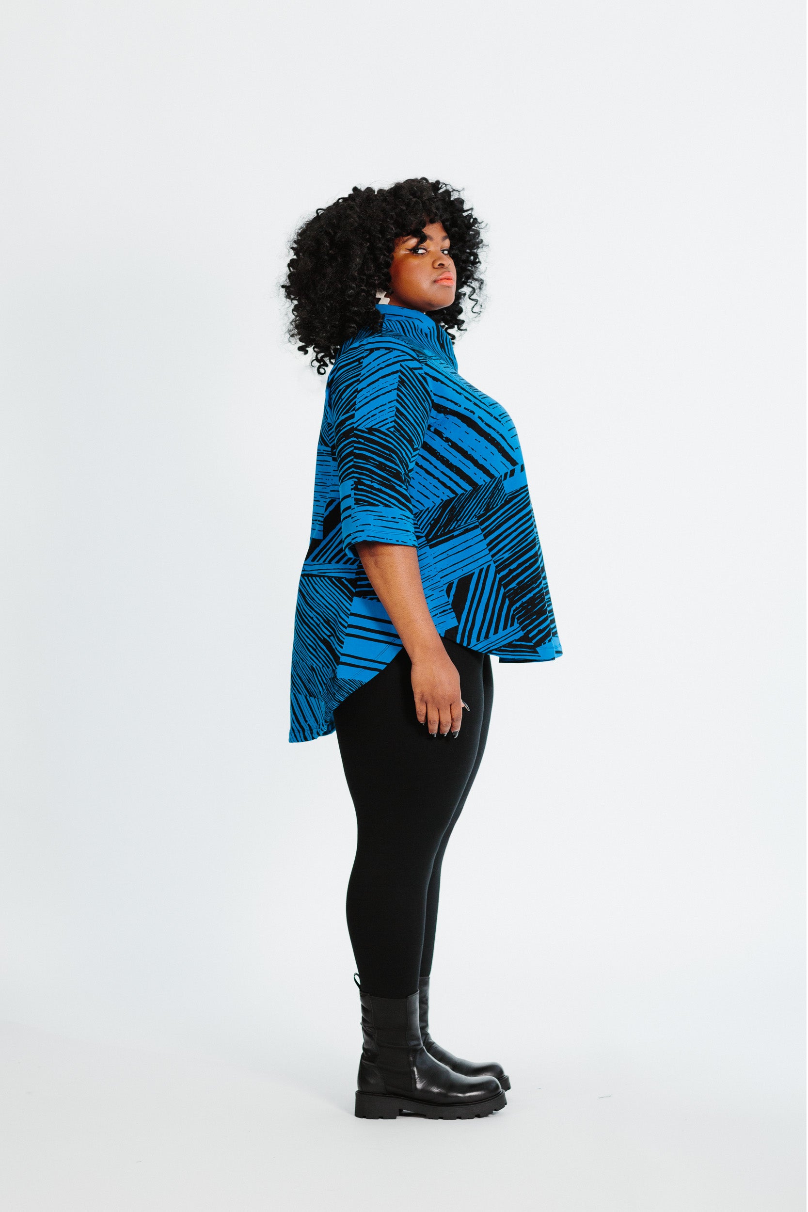 Our best-selling sweatshirt got a makeover! This updated Swing Sweatshirt features a criss-cross collar and a slightly longer silhouette. Please note this piece has extended sizing and is available in S-4X. Made with TIGRE textile print by Ryan Parker.